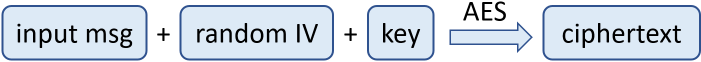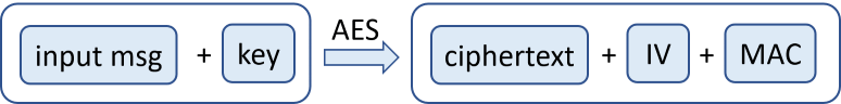 3. The **AES** encryption scheme takes as **input** the **input msg** + the encryption **key**. It produces as output the **ciphertext** + the randomly generated **IV** (128-bit salt) + the **MAC** code: