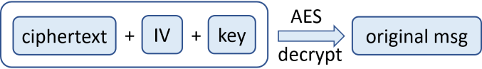 2. Use the decryption **key** and the **IV** from the encrypted message to decrypt the **ciphertext** using the **AES** algorithm decryption logic. The output is the **original message** (the **input msg**, which was previously passed through AES encryption):